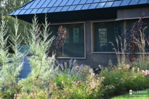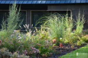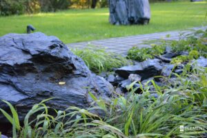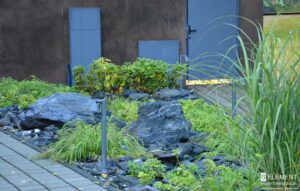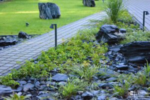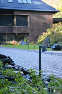 Uwagę przyciągają bazaltowe głazy – ciemne, ciężkie i eleganckie, które pięknie kontrastują z delikatnością roślin. Ich barwa idealnie komponuje się z grafitowym kolorem dachu i brązowymi spiekami na elewacji budynku i ogrodzeniu. Tworzy to spójną i wyważoną kompozycję. W tym samym odcieniu dobrano nowoczesne oświetlenie ogrodowe, subtelnie podkreślające formy roślin po zmroku.