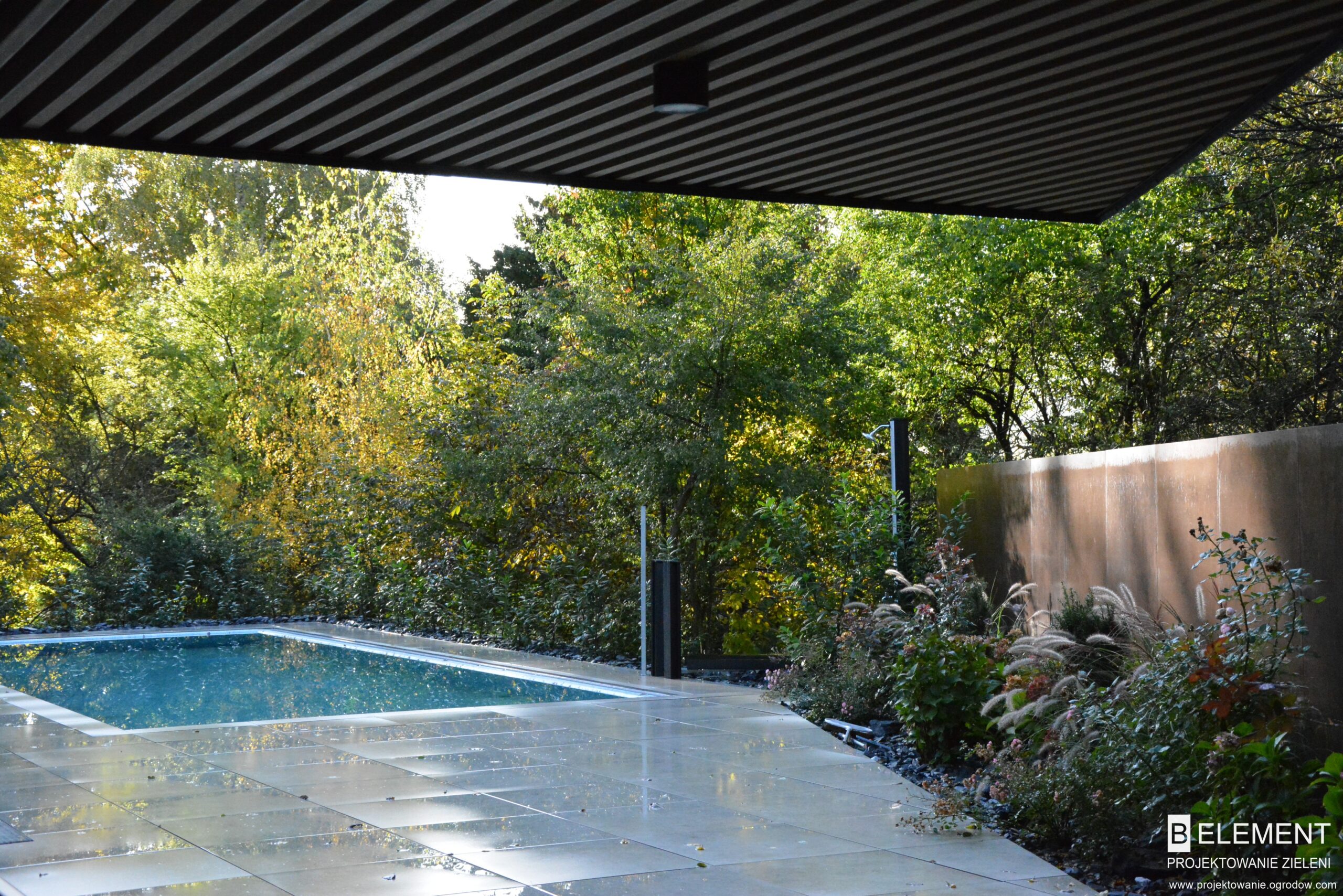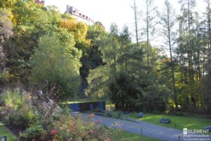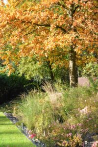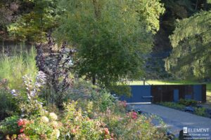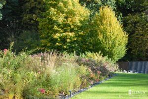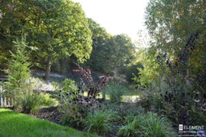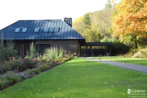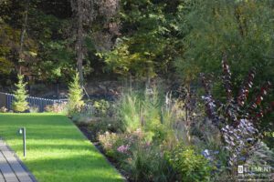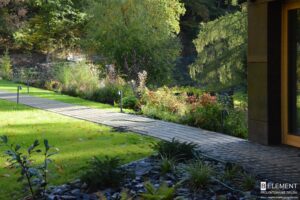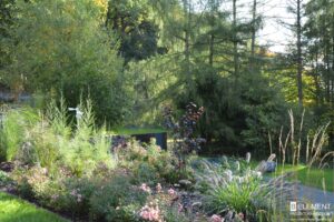 Ten przestronny ogród został zaprojektowany w bezpośrednim sąsiedztwie lasu liściastego, który tworzy naturalne, malownicze tło dla całej kompozycji roślinnej. Starannie dobrane gatunki roślin zapewniają zmienność i kolorystykę o każdej porze roku – od wiosennych kwitnień, przez letnią bujność, aż po jesienne barwy i zimową strukturę. Różnorodność nasadzeń sprawia, że ogród tętni życiem i pozostaje atrakcyjny niezależnie od sezonu, tworząc harmonijną całość z otaczającym krajobrazem.