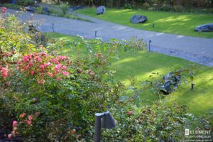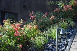 Centralnym wyzwaniem była duża skarpa, która dzięki odpowiedniemu doborowi roślin nie tylko stała się stabilna, ale i niezwykle dekoracyjna. Została obsadzona różami okrywowymi, tworzącymi gęste, barwne poduchy kwiatów. Ich długie kwitnienie sprawia, że ogród zachwyca kolorem od wiosny aż do późnej jesieni. Wśród róż pojawia się irga oraz sosna kosodrzewina, zimozielone i odporne, dodające struktury również zimą.