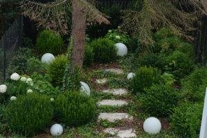 Między roślinami została wkomponowana ścieżka z betonowych, białych płyt, a całość oświetlają subtelne lampy w formie białych kul, które delikatnie podkreślają strukturę ogrodu i dodają mu nowoczesnego charakteru.
