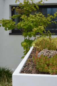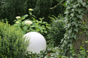 W projekcie dominują rośliny zimozielone, dobrane pod względem zróżnicowanych odcieni zieleni oraz form. Najczęściej powtarzającym się kształtem jest kula, która wprowadza do ogrodu poczucie ładu i harmonii. Białe akcenty tworzą hortensje krzewiaste z kulistymi kwiatostanami oraz świecznice groniaste, których smukłe, pionowe kwiatostany dodają kompozycji lekkości i elegancji.